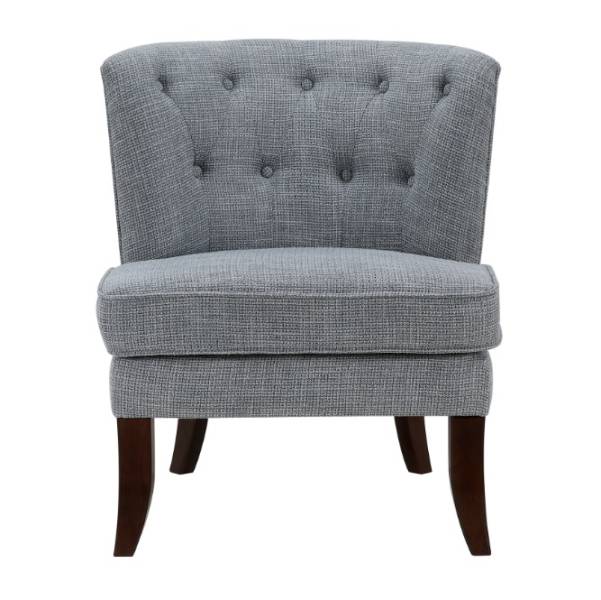 Add a touch of classic elegance to your home with this beautifully tufted accent chair. Featuring a traditional silhouette and delicate button tufting, this chair exudes sophistication and charm. The soft, textured dark gray fabric upholstery complements a variety of interior styles, while the generously cushioned seat provides exceptional comfort. Sturdy dark wood legs add a touch of contrast and stability, making this chair a perfect addition to your living room, bedroom, entryway, or dining area. Enhance your space with this versatile and stylish accent piece that seamlessly blends timeless design with modern comfort.