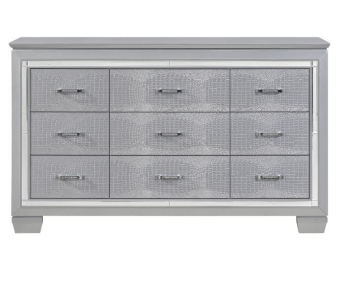 Glamour reigns in the design of the Allura Collection. Framing the dresser is a decorative beveled mirror accent that serves to reflect the alligator embossing of the drawer fronts, along with the high polished crystal-enhanced hardware that boldly decorates the silver finish.