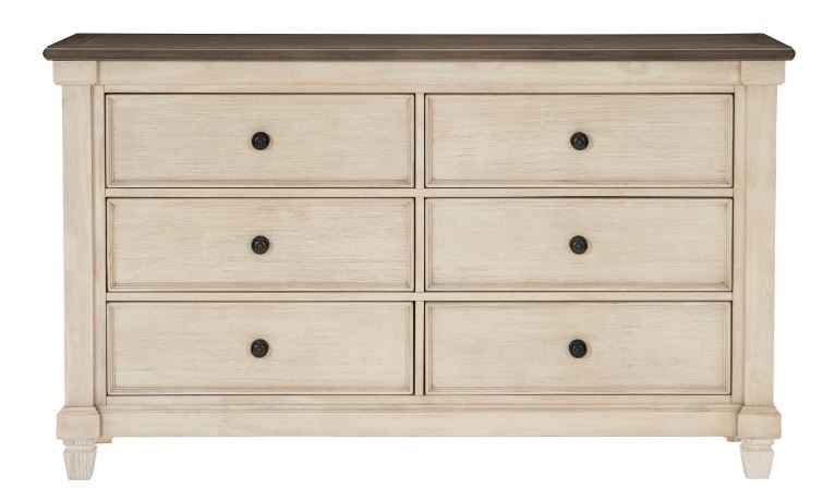 Transitional-rustic styling is expertly achieved in the design of the Weaver Collection. Antique white provides bold contrast to the rosy brown plank-style tops, with pine solids and oak veneer further lending visual texture to the dresser. Classic framing paired with dark metal knob hardware complete the rustic look.