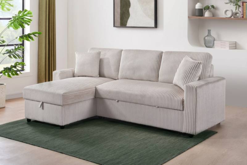 Transform your living area into an ideal spot for unwinding with the Brecker Collection. While this sleek sofa-sectional is a great spot to sit, the loveseat is also home to a hidden bed that you can pull out for longer naps or overnight guests, making it a multipurpose cornerstone for your living area. Dressed in light beige upholstery, the plush corduroy fabric offers a perfect blend of warmth and visual appeal that makes curling up to relax feel heavenly. The reversible chaise is designed for assembly at either end of the loveseat so that you don't have to disturb your existing room configuration, and it also opens to reveal a place to store your extra blankets and sundries. Complete with square track arms, removable back cushions, and matching toss cushions for additional lumbar support, the Brecker allows you to effortlessly dive into irresistible coziness.