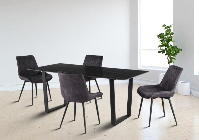 The Zion dining set includes a stylish table and four chairs, making it an ideal choice for your dining space. The contemporary design of the Zion set will instantly elevate the ambiance of your dining room, giving it a fresh and trendy look. The table features a 12mm ceramic tabletop adorned with cascading veins, a design element that adds a touch of sophistication with distinctive pattern. The ceramic surface is not just beautiful but also incredibly resilient, guaranteeing that your dining table remains a statement piece for years to come. Complementing the elegant tabletop are the black powder-coated splayed legs. These legs offer both stability and a sleek, modern aesthetic, ensuring that your dining area is not only stylish but also sturdy. The Zion Dining Chairs are designed with tufted accents, adding a layer of comfort and luxury to your dining experience. These details not only enhance the visual appeal of the chairs but also provide a cozy and inviting place to sit during meals and gatherings.