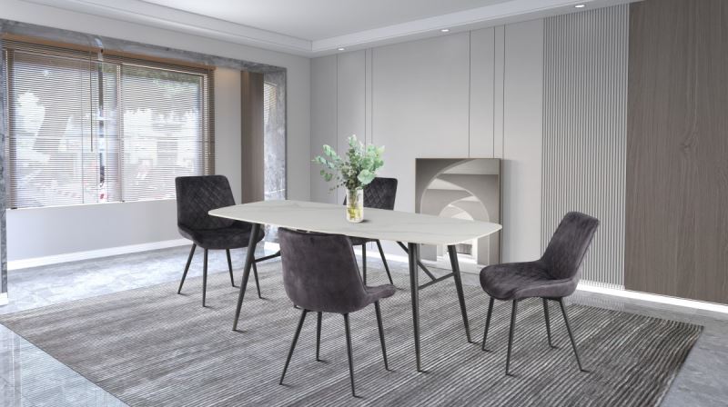 The exquisite Easton Dining Set comes complete with a table and four chairs, providing everything you need to create a stylish and comfortable dining area. The contemporary styling of the Easton set effortlessly fits into any modern interior, making it a versatile choice for your home. The dining table features a remarkable 12mm ceramic tabletop adorned with cascading veins. This intricate detail adds a touch of elegance to your dining space, making each dining experience special and memorable. The ceramic surface not only boasts beauty but also durability, ensuring that your table remains a cherished piece for years to come. The table and chairs are supported by black powder-coated splayed legs that not only enhance the overall aesthetics but also offer stability and strength. These legs are not just functional; they are also a design element that seamlessly complements the set's contemporary style. The chairs feature tufted accents, adding a layer of sophistication and comfort. These accents not only elevate the visual appeal of the chairs but also provide a cozy seating experience for you and your guests.