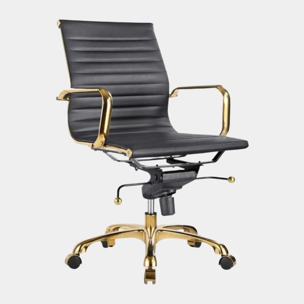 Low back office chair with PU leather upholstery and metal gold or chrome frame, polished finish.