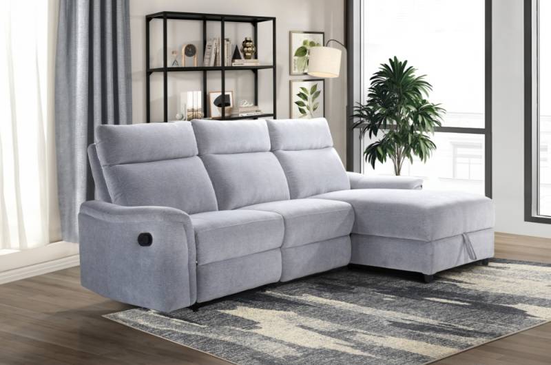 The Skava Collection unites contemporary design with modern comfort, creating the perfect seating arrangement for your living room. This refined sofa-chaise doubles down on style with a chic profile paired with airy grey chenille upholstery that serves as the ideal canvas for your decorative preferences. While the right side chaise is a great option for stretching out, the left side arm chair extends as well thanks to the tab-pull latch reclining mechanism. That is not the only convenient feature; the chaise also features a lift-top storage compartment that provides extra space, helping to keep clutter to a minimum. The cushioned track arms and tailored accent stitching are just icing on the cake of comfortably supportive seating. Effortlessly suave and inherently multi-functional, the Skava seamlessly combines flexibility and style to complement your modern lifestyle. Reverse configuration also available.