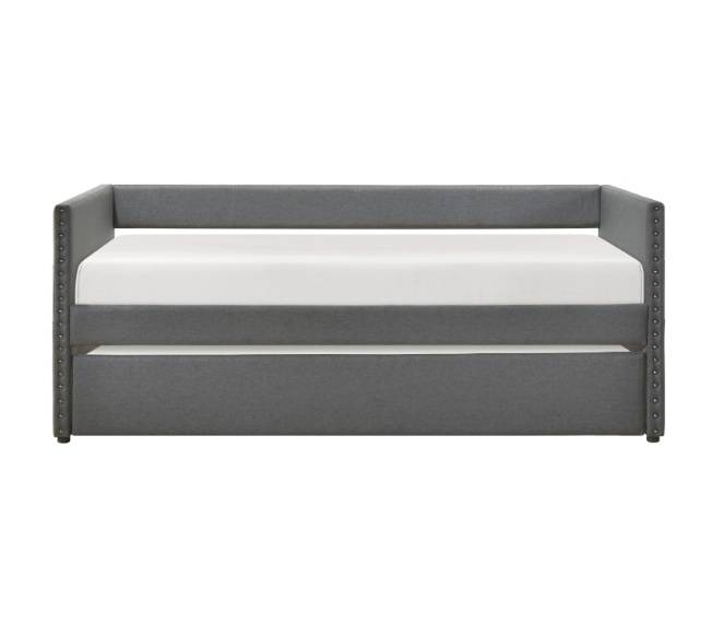 Maximize your guest room or living space with this stylish dark gray textured fabric daybed, featuring a convenient pull-out trundle bed for extra sleeping space. Crafted with a sturdy plywood and engineered wood frame, soft textured fabric upholstery, and elegant nailhead trim, this daybed offers both comfort and sophistication. The trundle bed, equipped with casters for easy movement, provides a seamless sleeping solution for overnight guests. Each side features convenient storage pockets for personal items. Designed to eliminate the need for a foundation or box spring, this daybed offers a sleek, modern look that complements various décor styles. Assembly is required and it ships in one box.