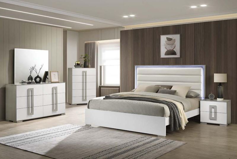 Enhance your bedroom with this contemporary bedroom set, featuring a sleek high-gloss white lacquer finish and a padded LED-lit headboard. Designed with clean lines and a minimalist aesthetic, this set adds a refined and modern touch to any space. The five-piece set includes a bed, dresser, mirror, chest, and nightstand, all crafted with soft-close drawers and elegant metal handles for both style and functionality. Built with durable materials, this set offers a long-lasting and sophisticated upgrade to your bedroom.