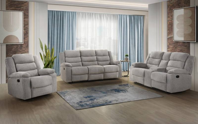 Get ready to snuggle up in style with the Tyrone 3-piece Reclining Set! This charming collection is the perfect addition to any cozy living space thanks to generously stuffed headrests and plush pillow armrests that invite you to relax and unwind in comfort. With an easy-to-use tab-pull latch mechanism, reclining is effortless – just pull, lean back, and enjoy the ride! The loveseat is particularly convenient thanks to a central console with storage and two cupholders so you can enjoy drinks anytime, and the recliner has a gliding mechanism for gentle motion. Upholstered in extra soft brown-grey fabric with a textured appearance and sensation, this collection brings a touch of retro cozy charm to your home. Plus, with durable framing under dense foam seat construction, this set is built to last. Allow the Tyrone to transform your living room into a relaxing haven and treat yourself to a blissful lounging experience.
