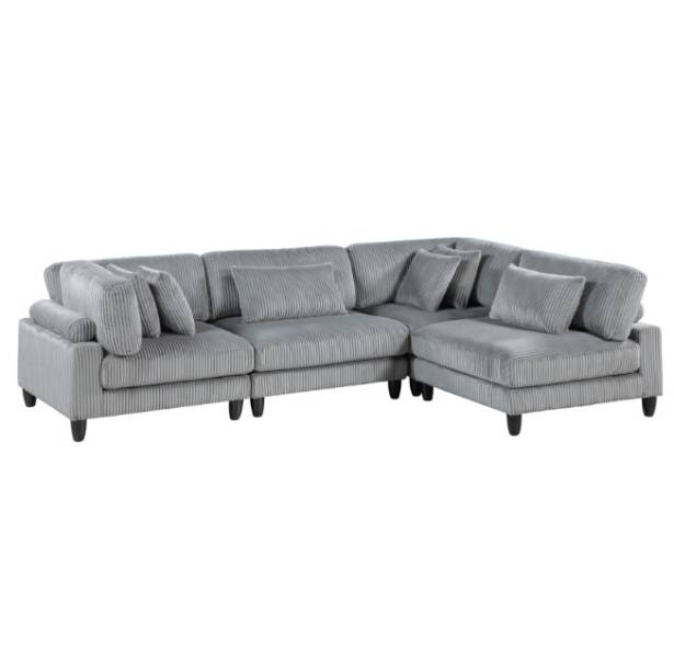 Create a customizable and comfortable living space with this gray corduroy 4-piece modular sectional. Featuring foam padding over pocket coils for superior comfort and support, and soft corduroy fabric upholstery for a plush feel, this sectional is perfect for lounging and entertaining. The modular design includes two corner seats and two armless chairs, allowing for flexible arrangement to fit your space. Reversible back and loose seat cushions extend the life of your sectional, while removable cushion covers with zippers simplify cleaning. Six matching pillows are included for added comfort and style. Solid wood legs in a black finish provide a sturdy and sophisticated foundation. Assembly is required.